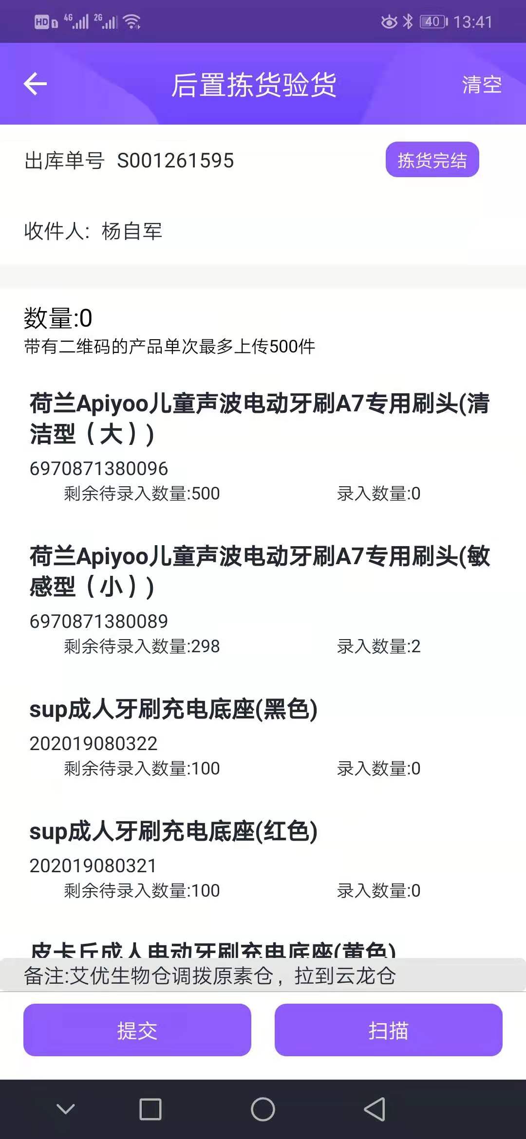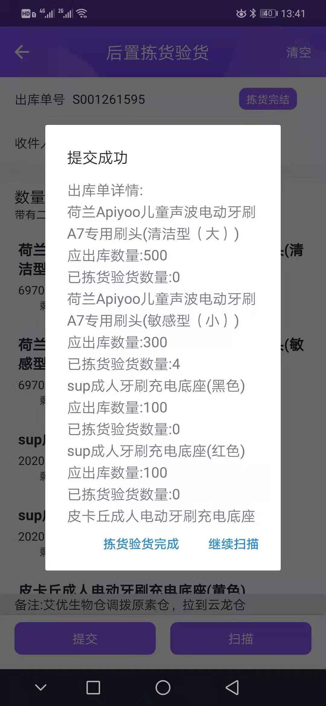 考虑到商品会出现不同的货架上,员工每拣一样产品,可以提交一次,防止意外退出导致拣货产品未保存。或者有两个员工分头去拣货,每个员工拣完一样产品后提交一次,可以让另一位员工知道拣货状态,防止重复拣货。带小码的产品,数量按扫入的小码计算,整箱发货可扫大码来获得小码信息
