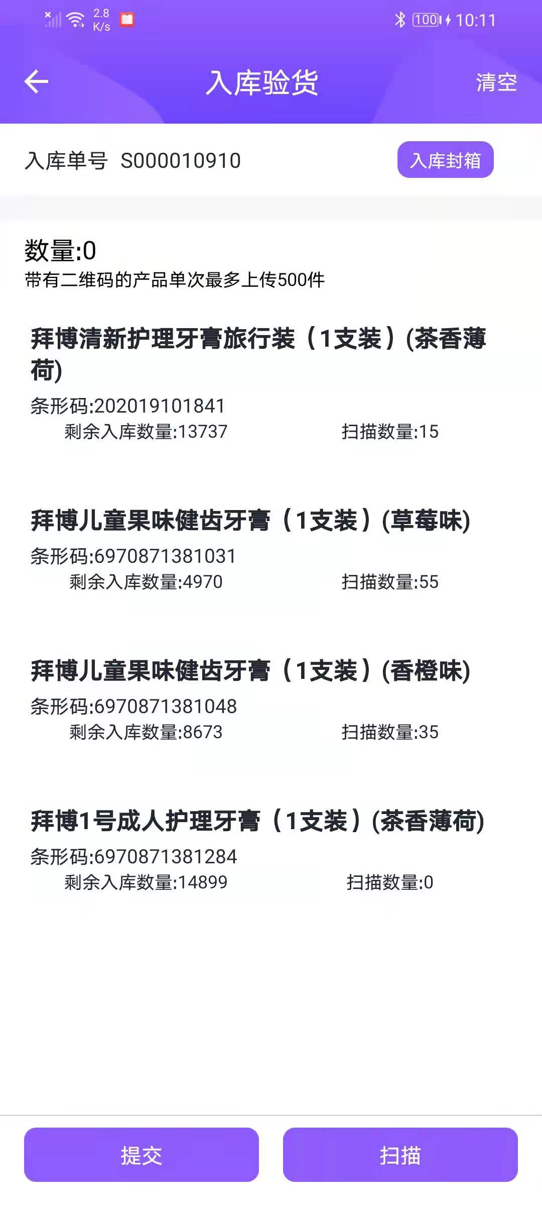 提交 考虑到入库产品过多,这里支持多次提交。当点完一堆后,可以先点击提交。